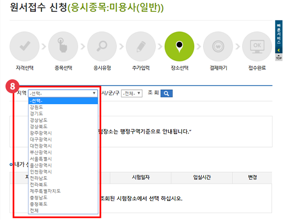 시험 응시하고자 하는 지역 선택
